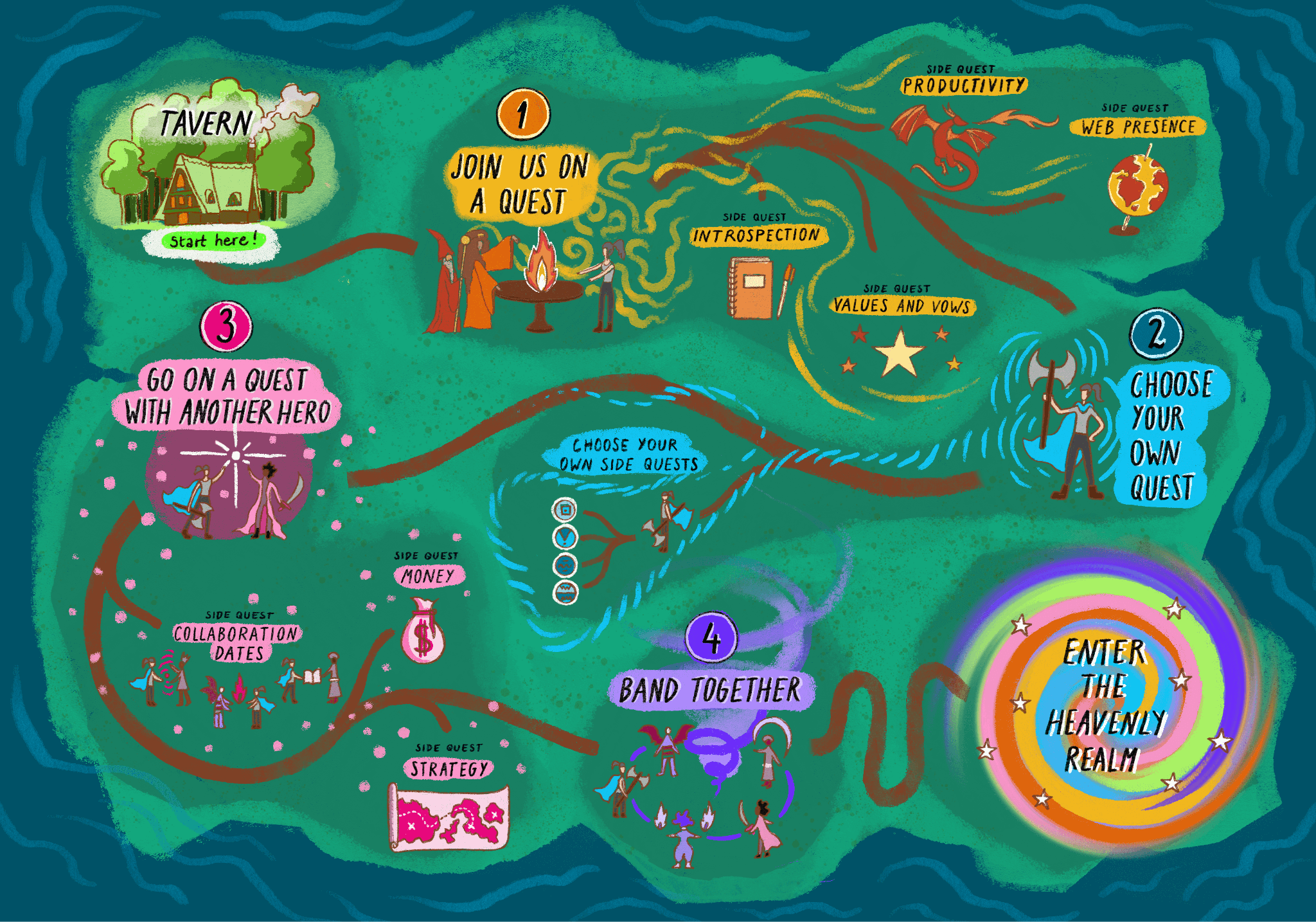 I later made my own spell, and started some with two other friends, also. I would say that all four of us are working on the “Money Side Quest” that’s in the Quest Map I made for the Empowerment Department (which Sílvia illustrated)—one that I have not yet solved.